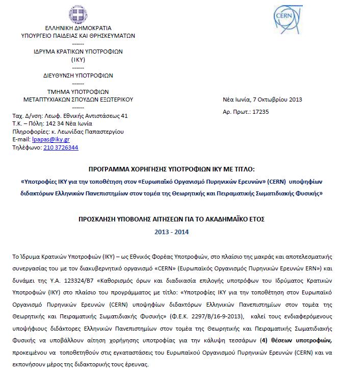 Πρόσκληση υποβολής αιτήσεων για την τοποθέτηση στο CERN Ελλήνων υποψηφίων διδακτόρων στη σωματιδιακή φυσική-2013 καταληκτική προθεσμία 10/11/2013.