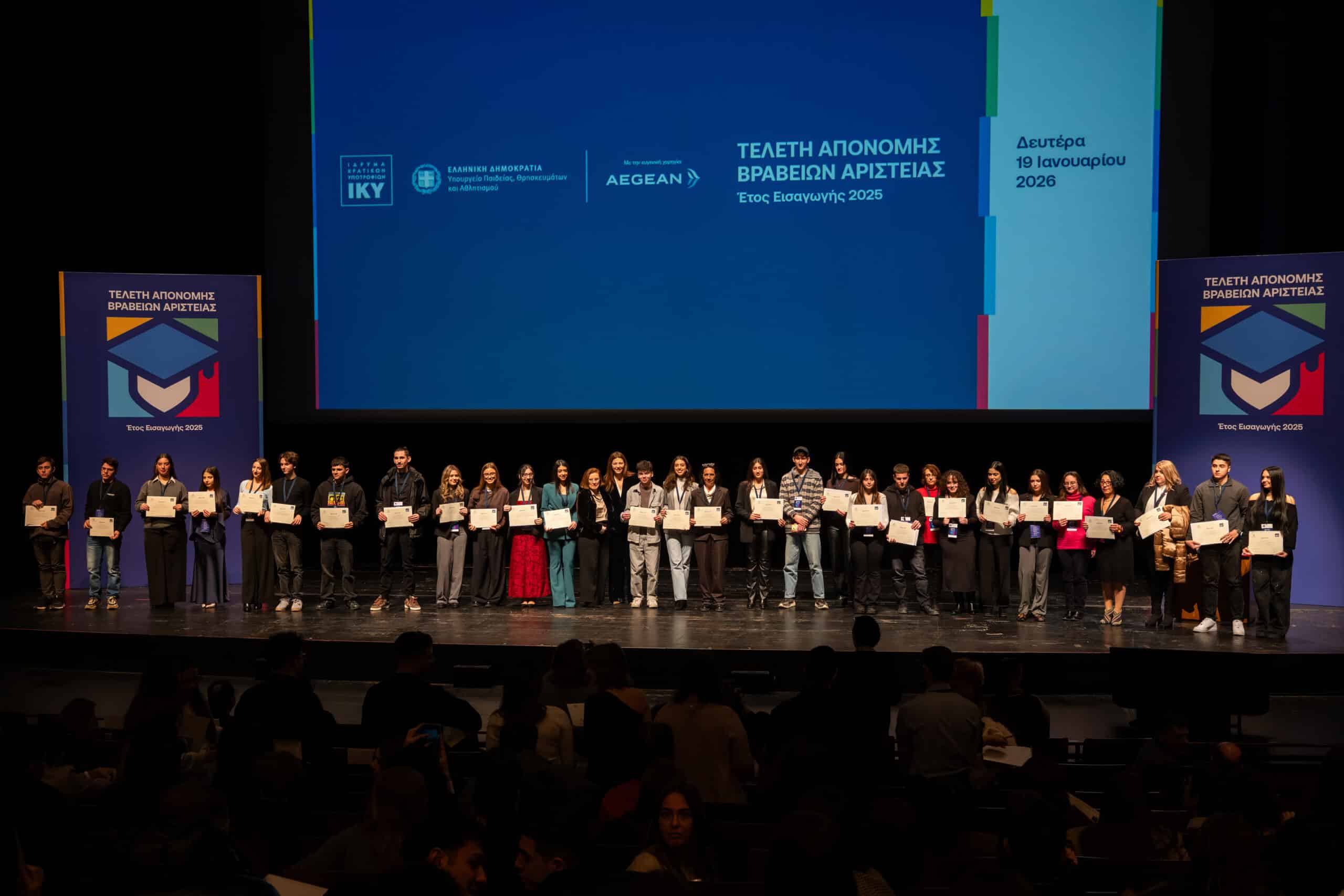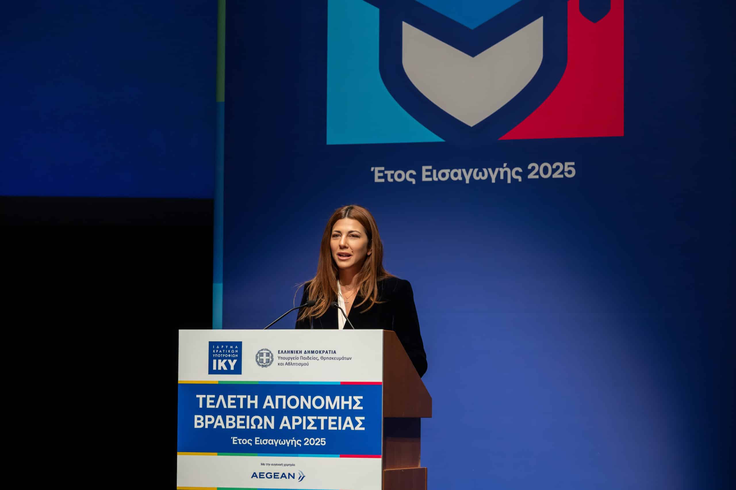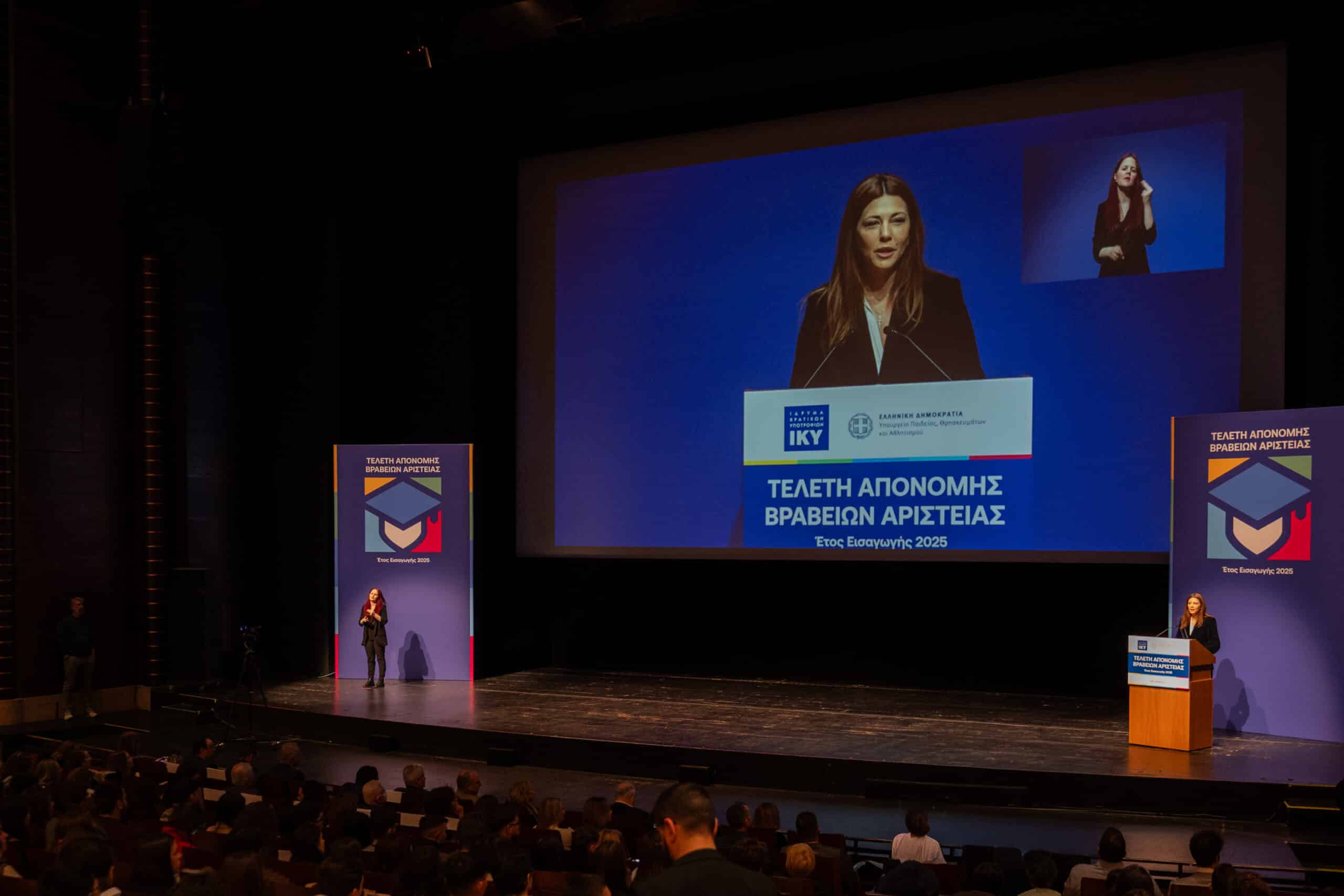 Με την υποστήριξη του Υπουργείου Παιδείας, Θρησκευμάτων και Αθλητισμού, το Ίδρυμα Κρατικών Υποτροφιών (ΙΚΥ), πραγματοποίησε την Δευτέρα 19 Ιανουαρίου 2026, στην αίθουσα «Αλεξάνδρα Τριάντη» του Μεγάρου Μουσικής Αθηνών, την επίσημη τελετή απονομής των Βραβείων Αριστείας στους/στις πρωτεύσαντες/σες εισαχθέντες/είσες όλων των Σχολών και Τμημάτων των Ιδρυμάτων Τριτοβάθμιας Εκπαίδευσης της χώρας. Τα βραβεία απένειμε η Υπουργός Παιδείας, Θρησκευμάτων και Αθλητισμού, Σοφία Ζαχαράκη.