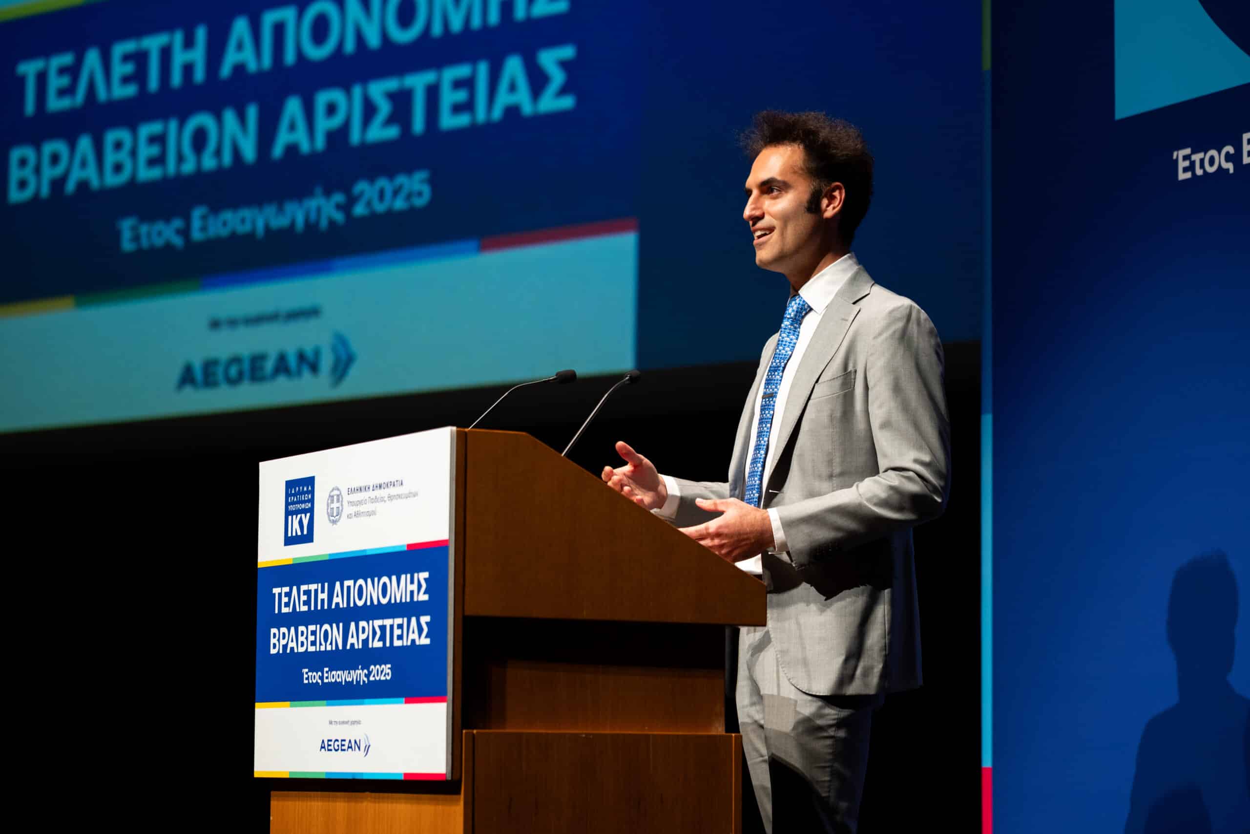 Χαιρετισμό απηύθυνε και ο Διευθύνων Σύμβουλος της AEGEAN, Δημήτρης Γερογιάννης, ο οποίος είπε χαρακτηριστικά: «Θα ήθελα να ευχαριστήσω το Ίδρυμα Κρατικών Υποτροφιών και το Υπουργείο Παιδείας για τη συνεργασία και τη δυνατότητα που μας έδωσαν να σταθούμε, για δεύτερη συνεχόμενη χρονιά, αρωγοί σε μια πρωτοβουλία που αναδεικνύει την αξία της προσπάθειας και της αριστείας. Σήμερα τιμούμε και επιβραβεύουμε τη σκληρή δουλειά των φοιτητριών και των φοιτητών της χώρας μας που αρίστευσαν. Η AEGEAN στηρίζει διαχρονικά τη νέα γενιά που ονειρεύεται, αγωνίζεται και επενδύει στον εαυτό της, με τη στήριξη των νέων να αποτελεί για εμάς μια σταθερή και όχι περιστασιακή δέσμευση. Είναι χρέος όλων μας, τόσο της ακαδημαϊκής κοινότητας όσο και του επιχειρηματικού κόσμου, να χτίζουμε γέφυρες ανάμεσα στη θεωρία και την πράξη, να δημιουργούμε ευκαιρίες και να ανοίγουμε δρόμους για τη νέα γενιά που θα διαμορφώσει το μέλλον». Απευθυνόμενος στους βραβευθέντες, τόνισε ότι η σημερινή διάκριση δεν αφορά μόνο τις υψηλές επιδόσεις, αλλά κυρίως τη στοχοπροσήλωση και την επιμονή που οδήγησαν στην αριστεία, επισημαίνοντας ότι «η αριστεία αποτελεί ένα σημαντικό πρώτο ορόσημο, όχι όμως τον τελικό προορισμό», και ότι η πραγματική επιτυχία χτίζεται καθημερινά μέσα από συνεχή προσπάθεια, μάθηση και εξέλιξη. Κλείνοντας, συνεχάρη όλους τους φοιτητές για τη διάκρισή τους, υπογραμμίζοντας ότι η AEGEAN θα συνεχίσει να συνοδεύει τη νέα γενιά στα ταξίδια της γνώσης και της ζωής».