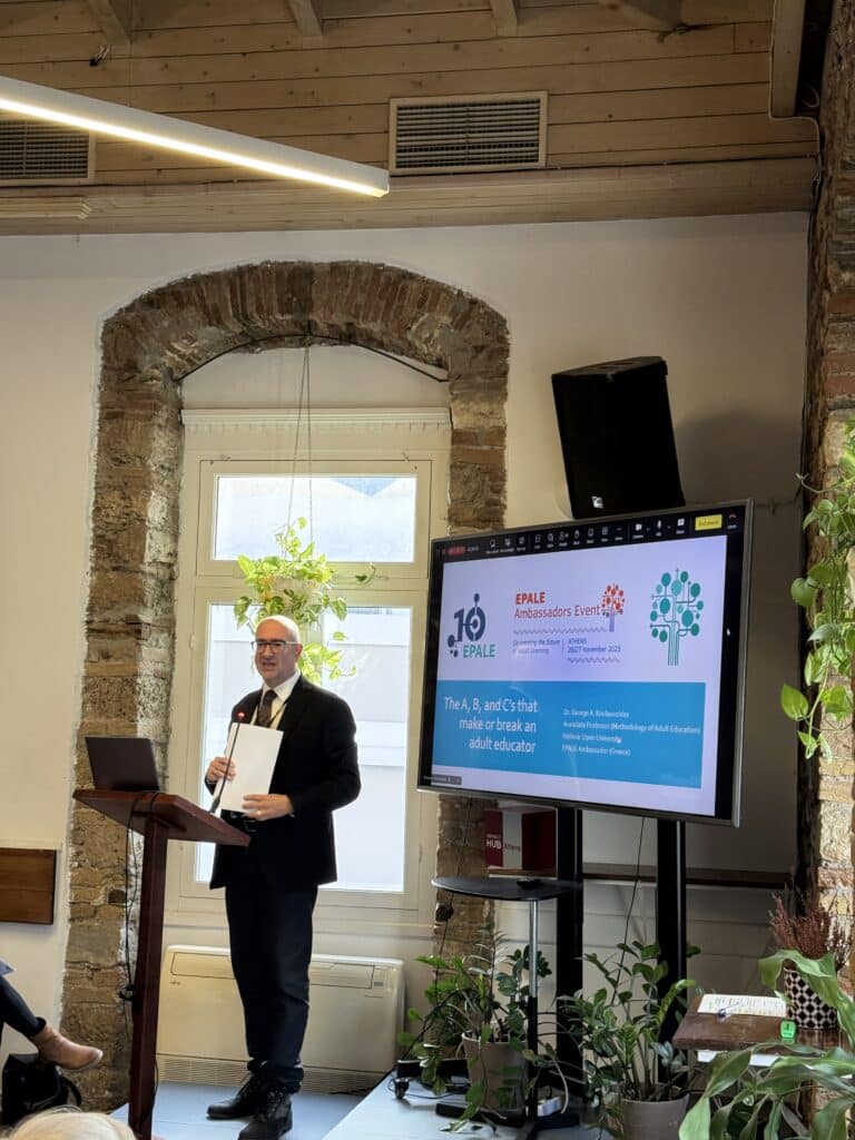 Το πρόγραμμα περιλάμβανε παρεμβάσεις από την Ευρωπαϊκή Επιτροπή και την NSS Greece, ενώ ξεχωριστή θέση κατείχε η κεντρική ομιλία του καθηγητή του ΕΑΠ, Αντιπρόεδρου της European Association for the Education of Adults (EAEA) και ΕPALE Ambassador, κ. Γιώργου Κουλαουζίδη, ο οποίος ανέλυσε τα χαρακτηριστικά που καθορίζουν την αποτελεσματικότητα των εκπαιδευτών ενηλίκων.